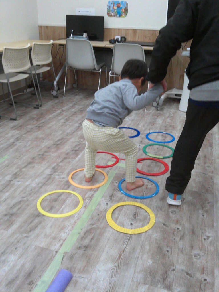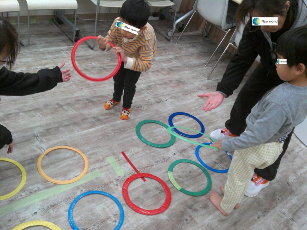 次はフープをジャンプジャンプ💨最後はマットに座って終了です。みんな座るところまで頑張りました💮