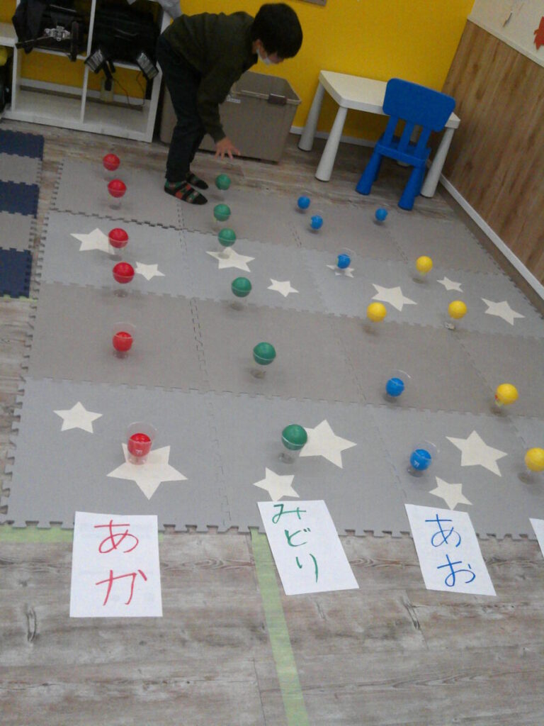 両手でカラーボールの入ったコップを持って、どんどん指定された色の位置へ。