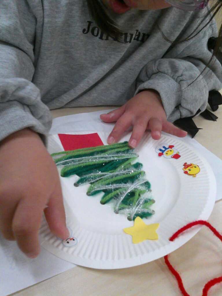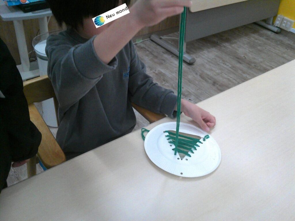 今日も製作活動です😊最初は裏表の穴に通す規則性が分からず、紙皿の外を毛糸で一周してしまうお友達。
