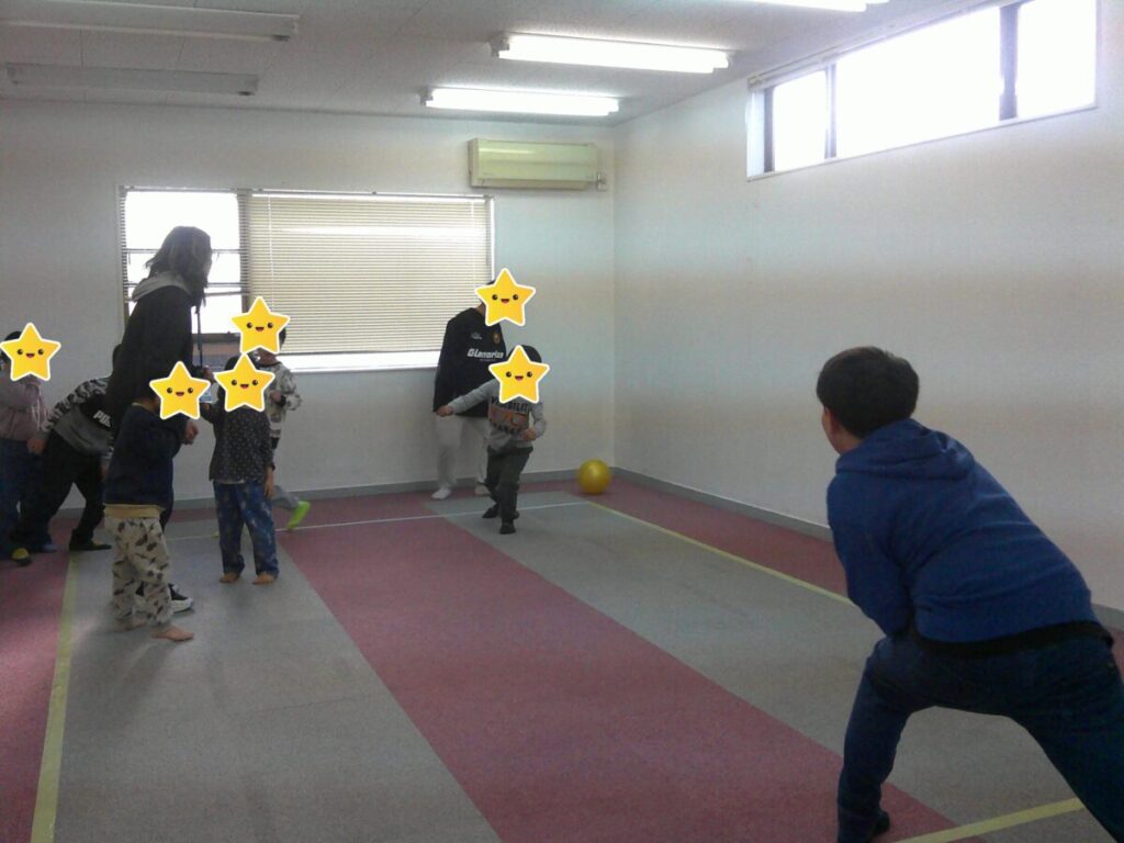 午後の小・中学生のトレーニングは「ころがしドッチボール」です!外野はボールを投げるのではなく、転がします。逃げられるエリアが決まっており、中にいるみんなはボールがどこへ転がってくるのか、周りのお友達にぶつからないかを確認しながら避けています。