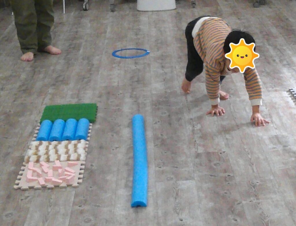 寒いけど靴下を脱いで、センサリーマットふみに挑戦!ぼこぼこ、ふわふわ、チクチク・・・触ったことのない物にもみんな恐れず挑んでいましたよ。