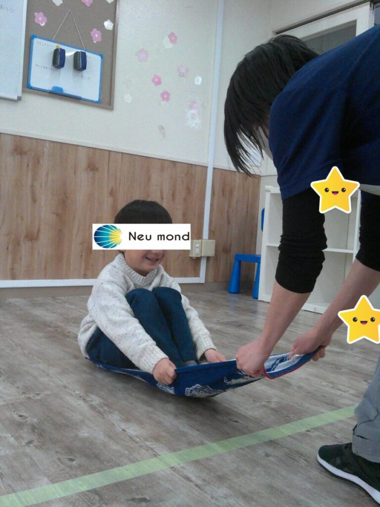 小さなお友達は、まずはタオルそりでびゅーん!