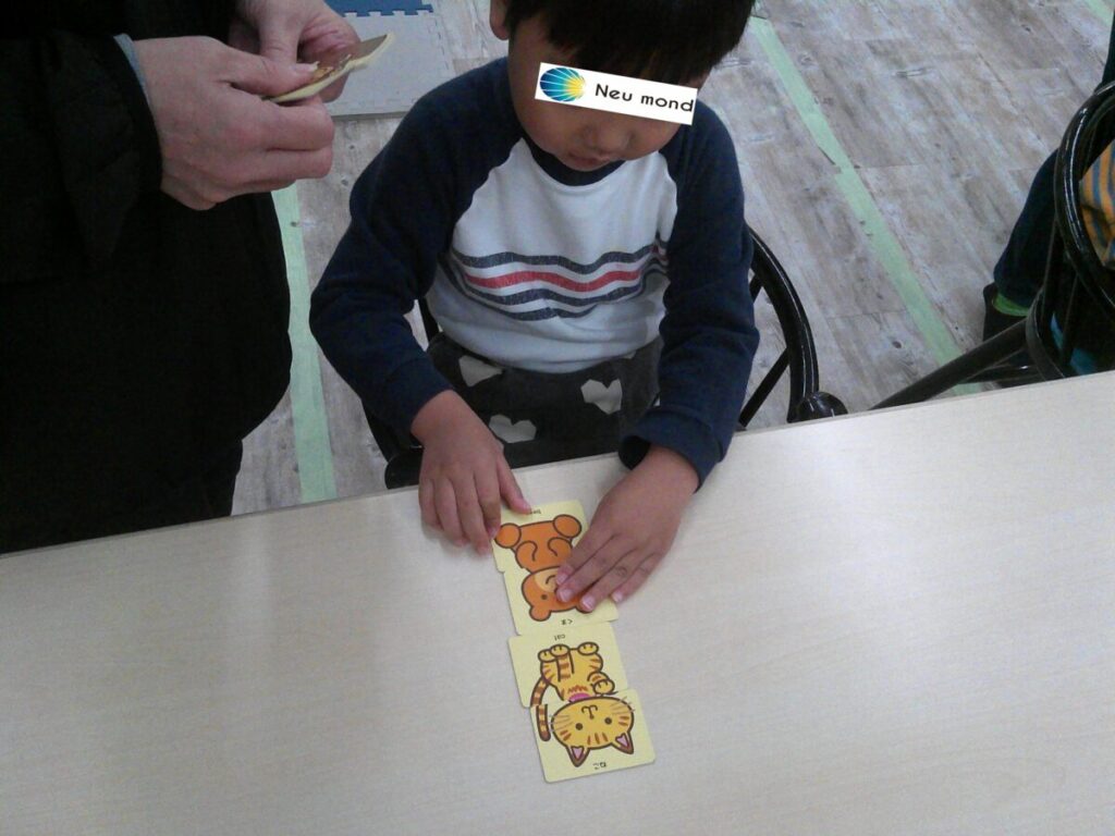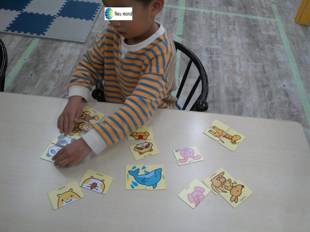 小さなお友達は、動物の身体をよ~く混ぜて…、さあ!合わせてみよう!絵合わせカードをしました。
