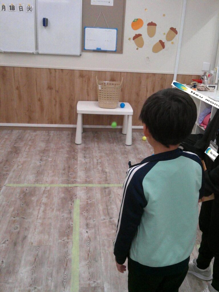 カゴの位置をよく見て投げます。強く投げたり、優しく投げたり、力加減を工夫していました😉