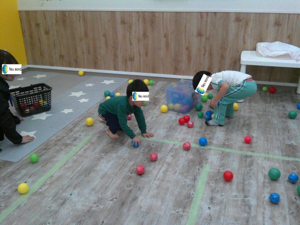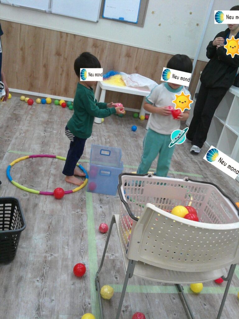 先生が色指定した色と同じ色のボールを集めて自分が担当したカゴに入れていきます。