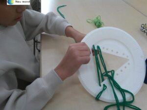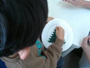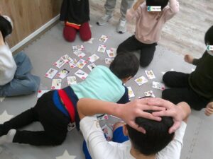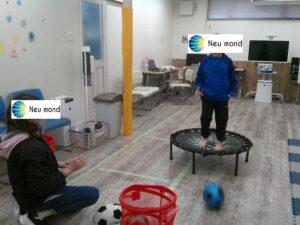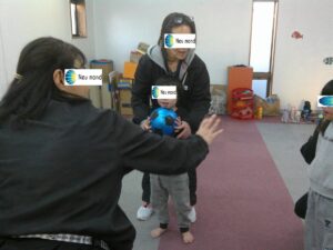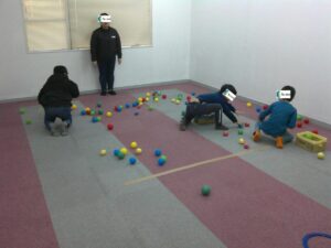 午後は、全員で輪になってボール渡しをしました。透明のプラスチックコップにいれたボールを右回り、左回りでとなりの人にわたしていきます😊 先生の「いち、に」の「に」合わせるのですが、ずれそうになっているお友だちもいました😁 でも、うまくわたしていけました🎶