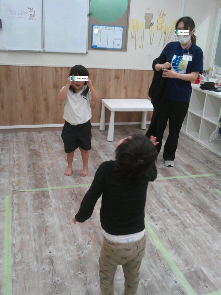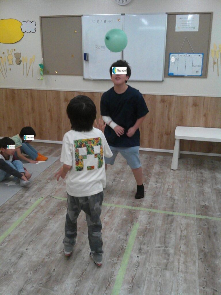 次は、ペアになって風船ラリーです🎵先生と一緒に取り組みながら、10回を目指して頑張りました😉