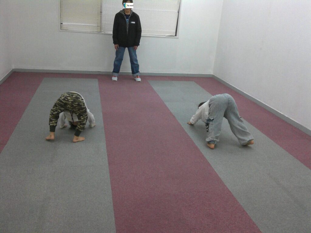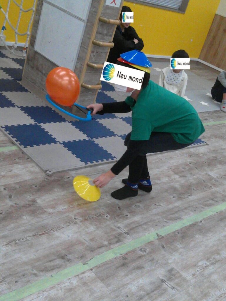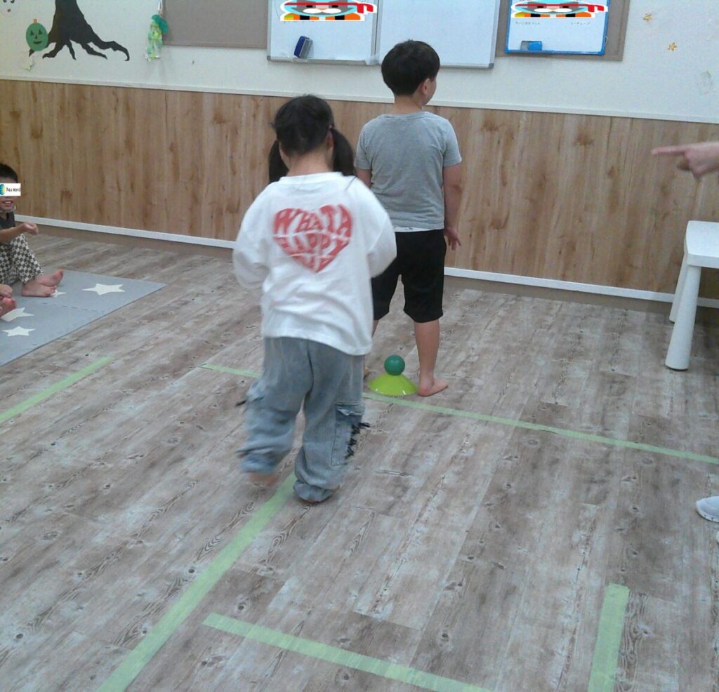耳を澄ませて... 相手の動きを感じます! 正面に背中を向けているお友達の足元にはボールやマーカーコーンが置いてあります。 後ろから他のお友達が近づいてきて足元のボールやマーカーコーンを取ります🥎 正面向いているお友達は急いで後ろにいるお友達を... -