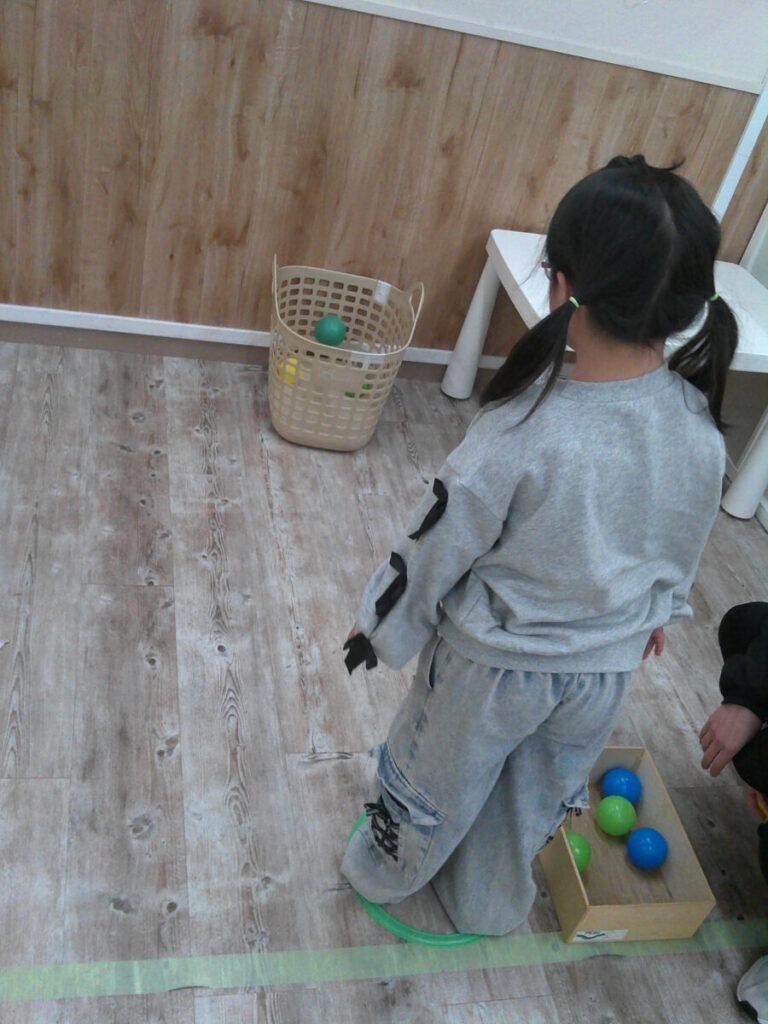 カゴの位置をよく見て投げます。強く投げたり、優しく投げたり、力加減を工夫していました😉 距離を伸ばして挑戦💪🏻最後まで一生懸命取り組みました✨ 小さなお友達は、動物の身体をよ~く混ぜて…、さあ!合わせてみよう!絵合わせカードをしました。 何の動... -