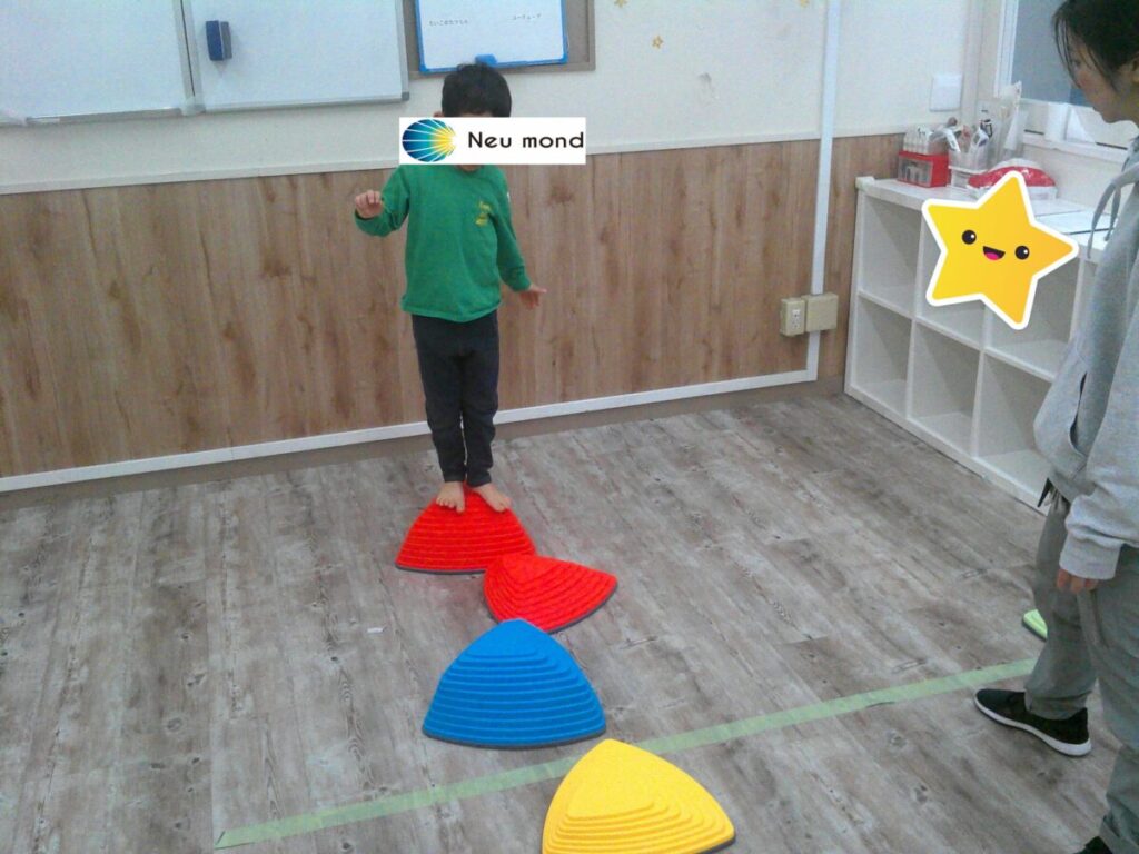 見本を見て、同じアイスを作ろう!沢山の種類のアイスから、色をよく見て選びます。 積み重ねる順番にも気を付けて😉難易度アップで、逆さの状態に挑戦したお友達も上手に出来ました✨ 小さなお友達は、サーキット運動です。 バランスストーンを渡って、トン...