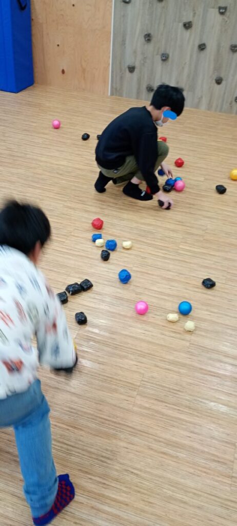 カラーボールを数色使い、指示された色を記憶して集めていきます。そして各色点数があるので、集めたら合計点数を各自出します。