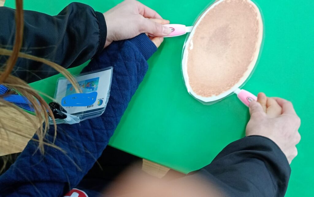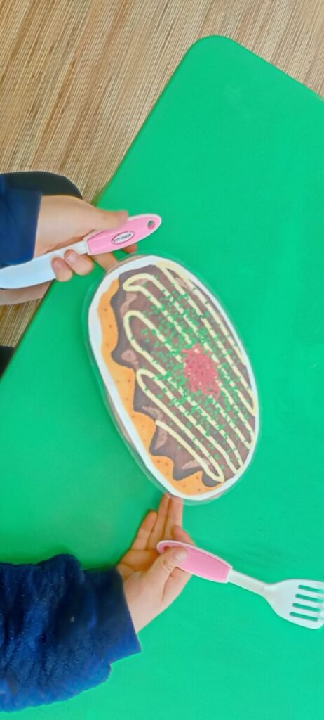 小さいお友達は、食べ物をおもちゃのフライ返しを使ってひっくり返すトレーニングをしました。