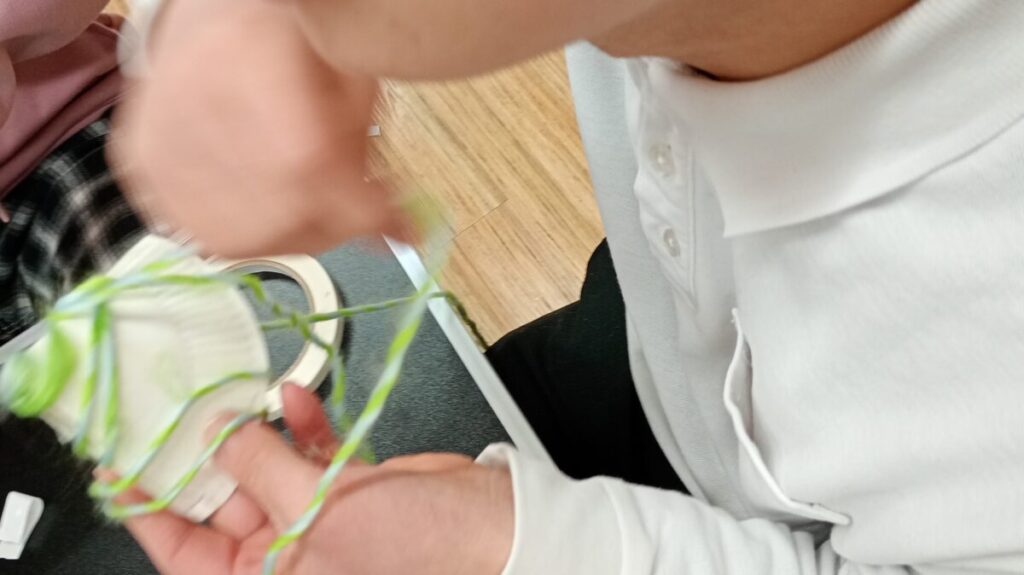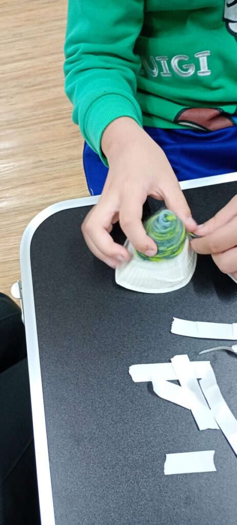 毛糸を紙皿にぐるぐる巻くのが上手に巻けなくても、諦めずにほどいて、何度もまき直し仕上げていました💕