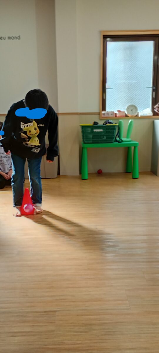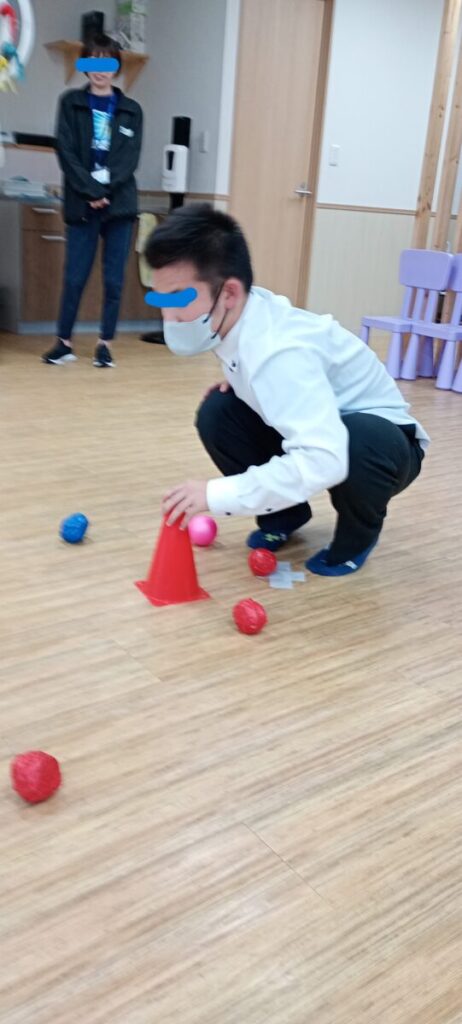 コーンを挟んでジャンプすること自体が結構難しく、それに付け加えて、ボールがどこに来るかを予測しながら、移動する….難易度が高いです。