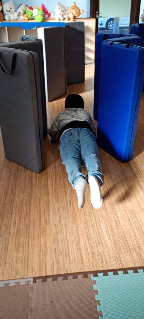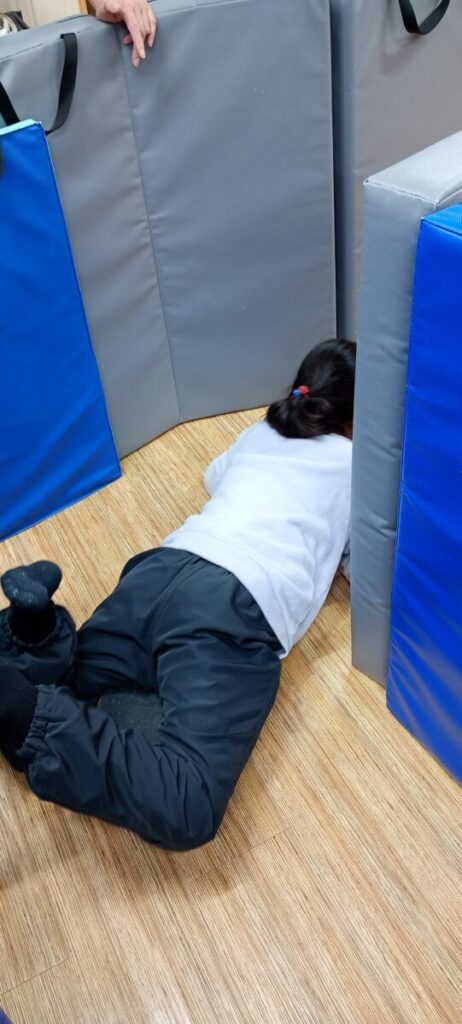 マットの隙間をスケーボーですり抜けます🛹体幹を使って、バランスを取りながらシュー🎶