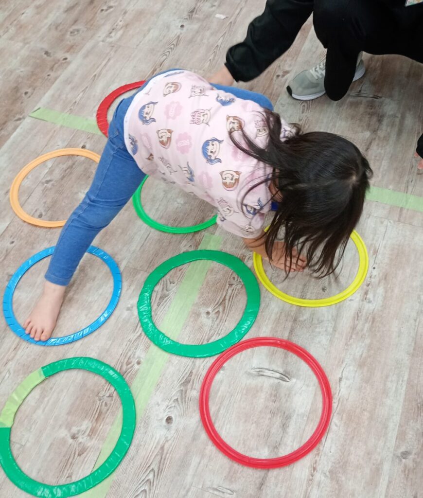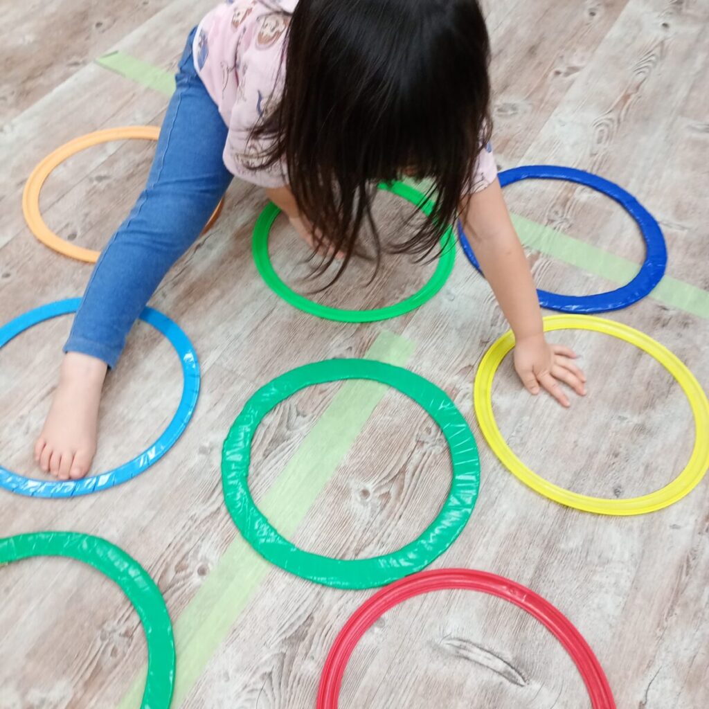 先生からの指定の色を聞きます👂そして、フープに手足を入れていきます。