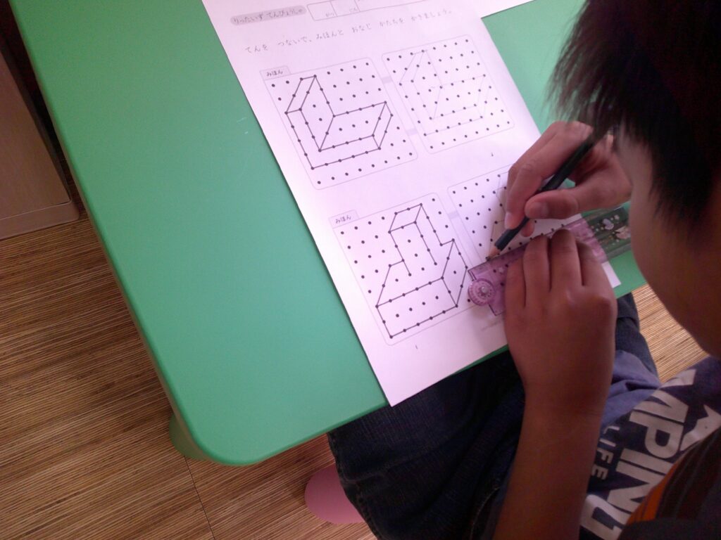 静かな活動での、立体図形描写は定規を使って丁寧に書いていましたよ。