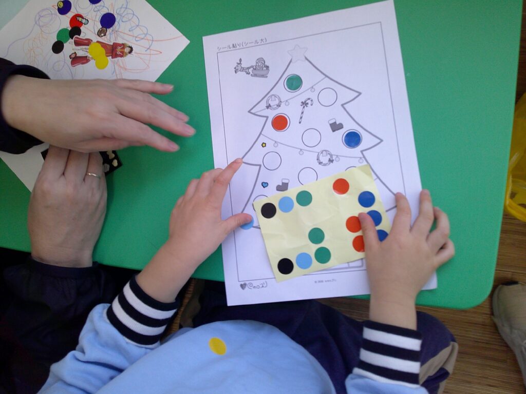 小さいお友達は、クリスマスツリーのシール貼りを頑張りましたよ😄