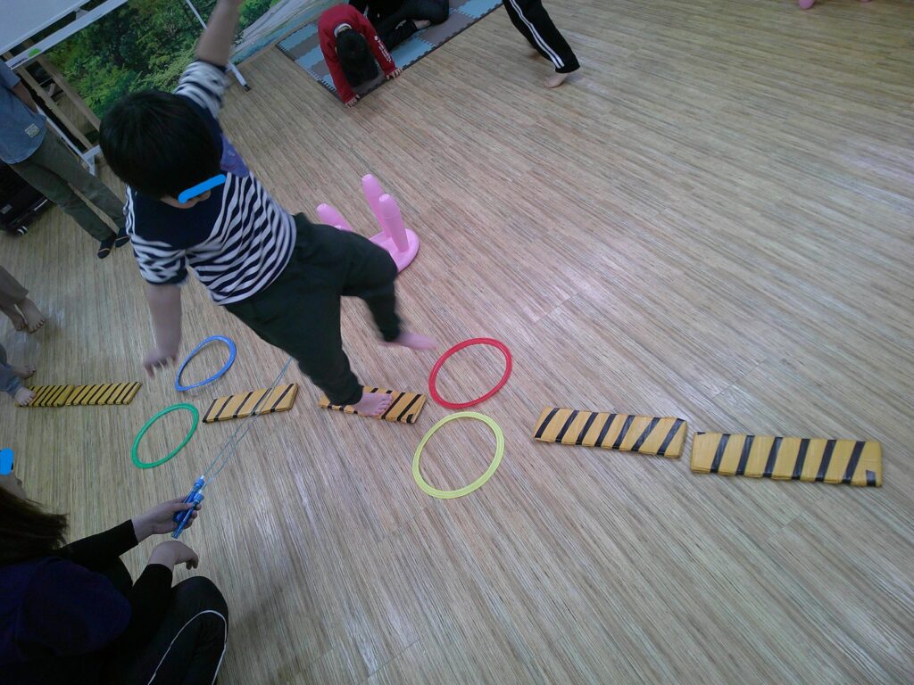 縄を跨いで平均台に戻ったり、ボールなどを持って手ではバランスがとりづらい状況を作り四肢を