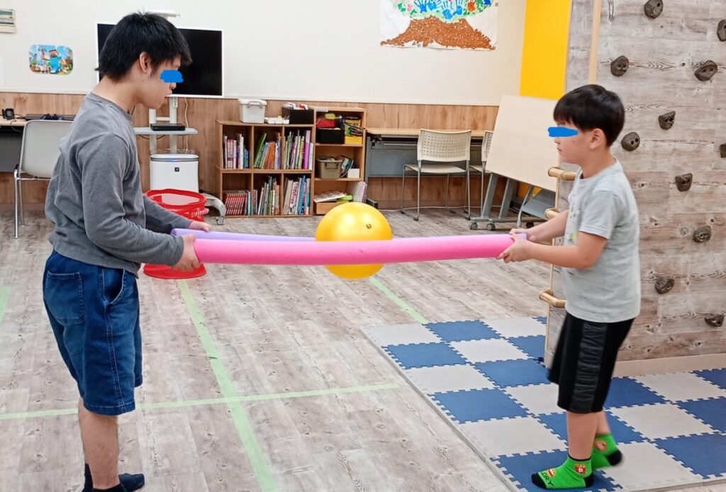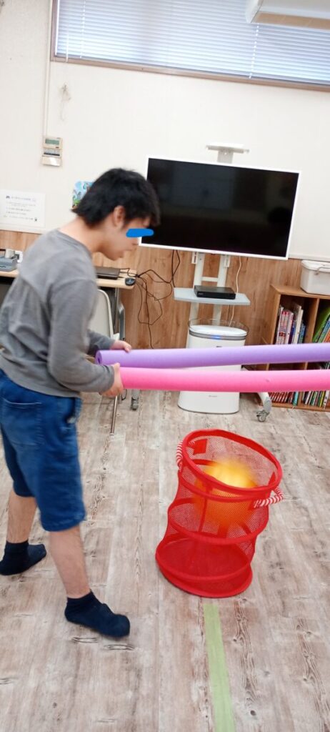 円柱のスティックと球体のボールでは安定しません。そこでお友だちは、スティックの持ち方や力加減を考えながら取り組んでいました😀