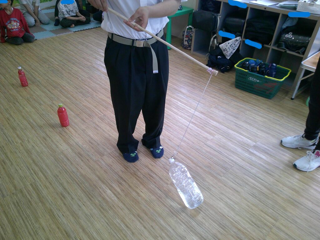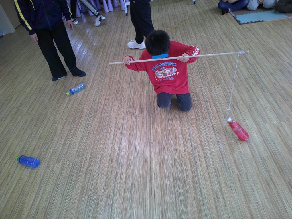 今日はペットボトルを用いて、床に置いてあるボトルを竿に模した器具でペットボトルを置きあがらせるトレーニングを