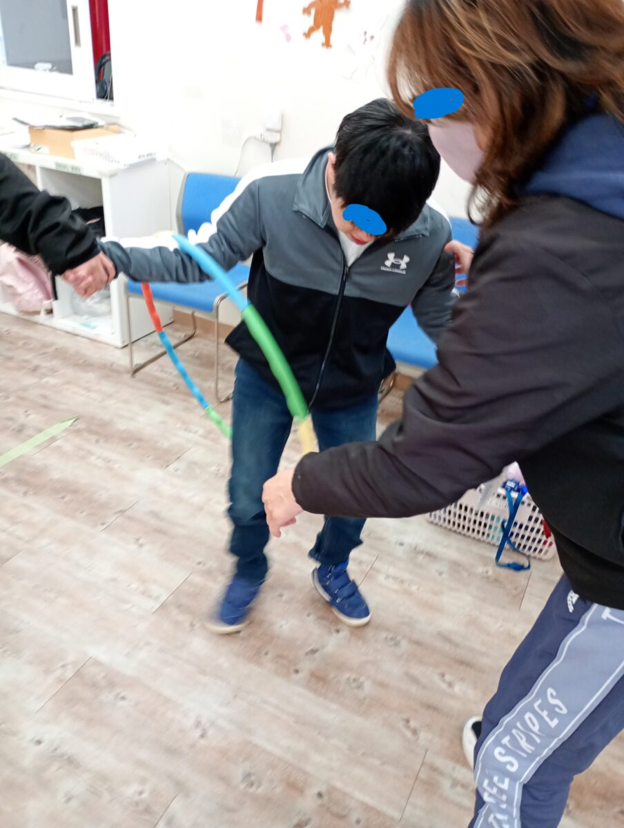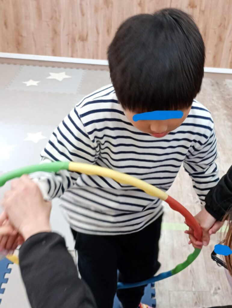 順番に自分の身体を使い、お友だちと協力しながらフープを渡していきました!