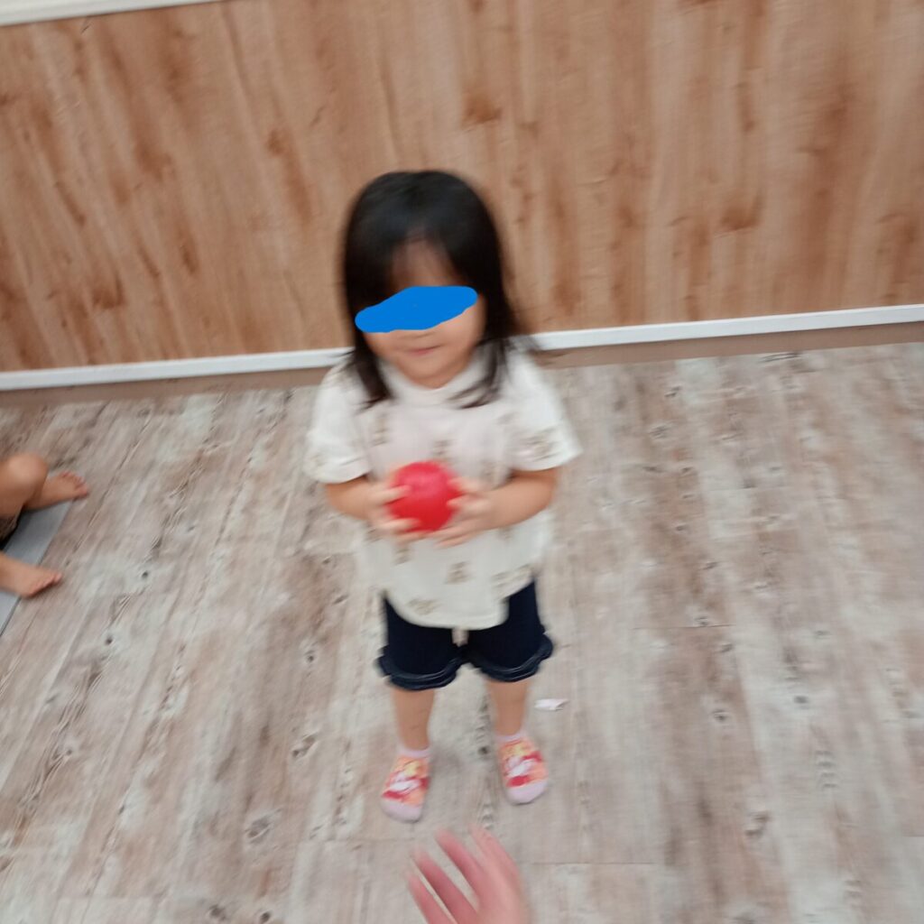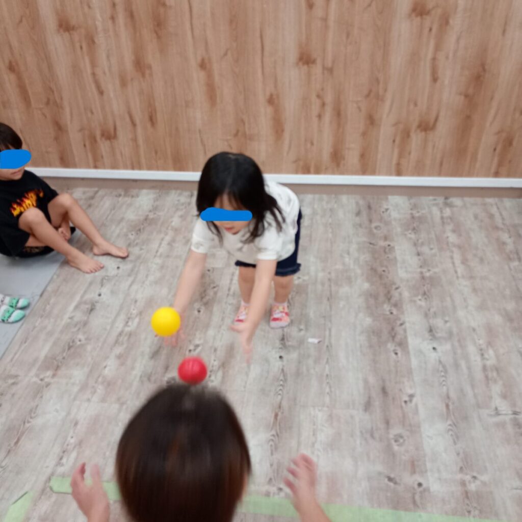 小さいお友達は、赤、黄の2色のボールを同時に投げます。