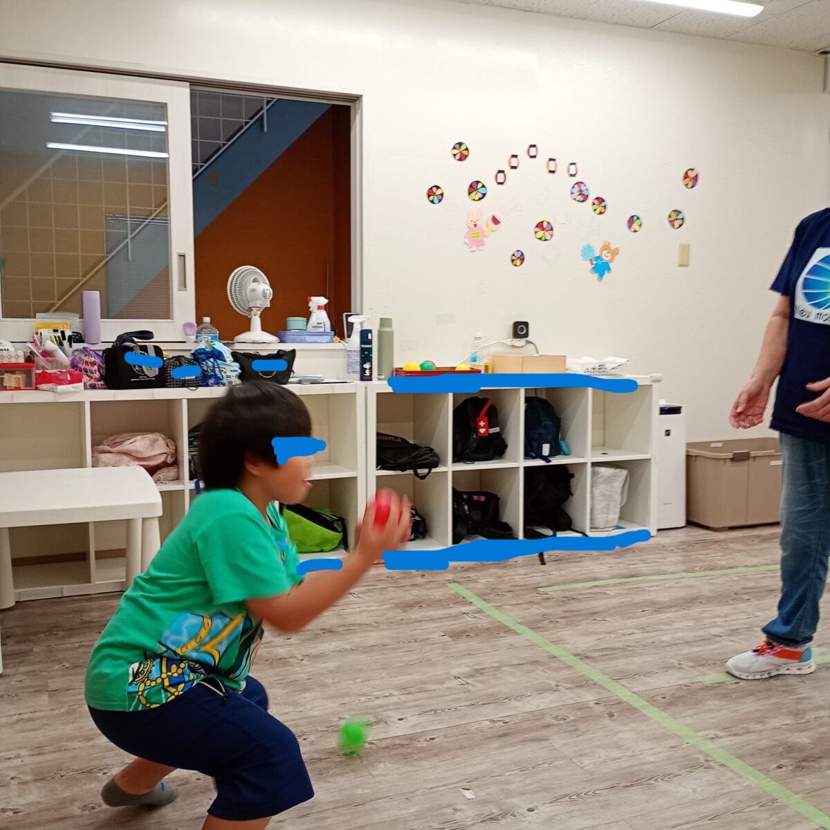 小さいお友達は、赤、黄の2色のボールを同時に投げます。