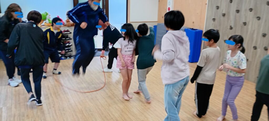 まず一回目は、ロープを波に見立て、子供達は一列に並び、迫りくるロープを一人ずつジャンプ!!