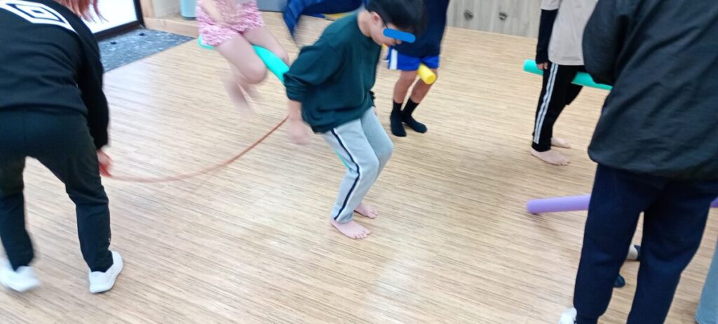 2人1組で、ステックを足に挟み、更に2列になり大波小波にチャレンジ🦾
