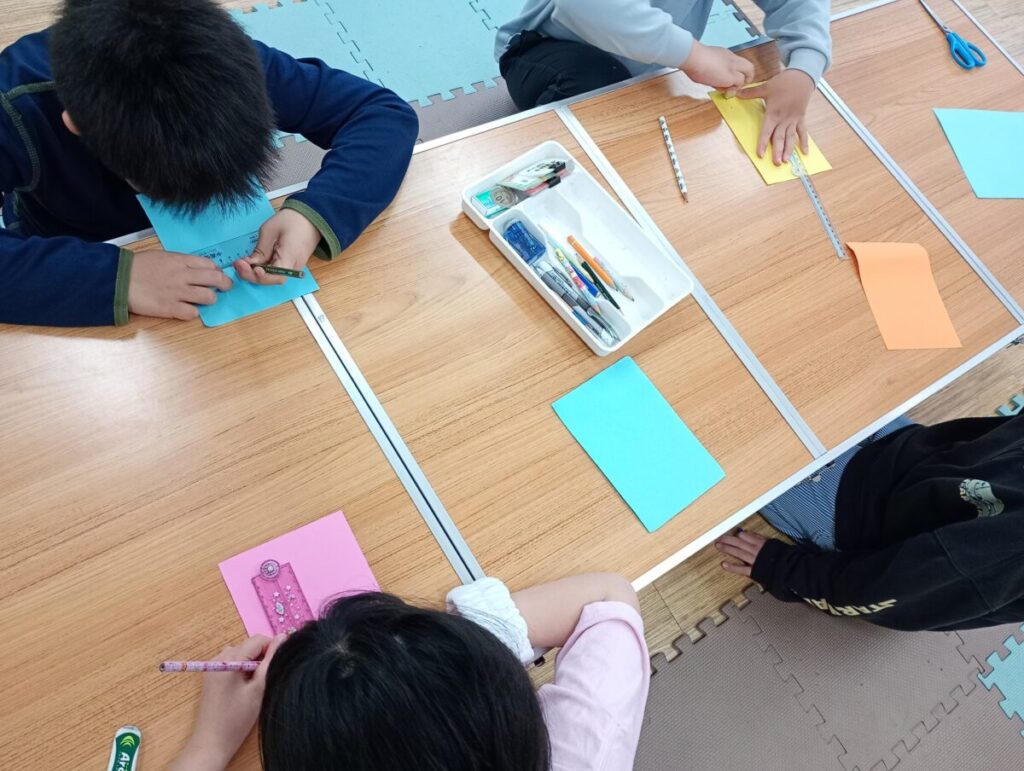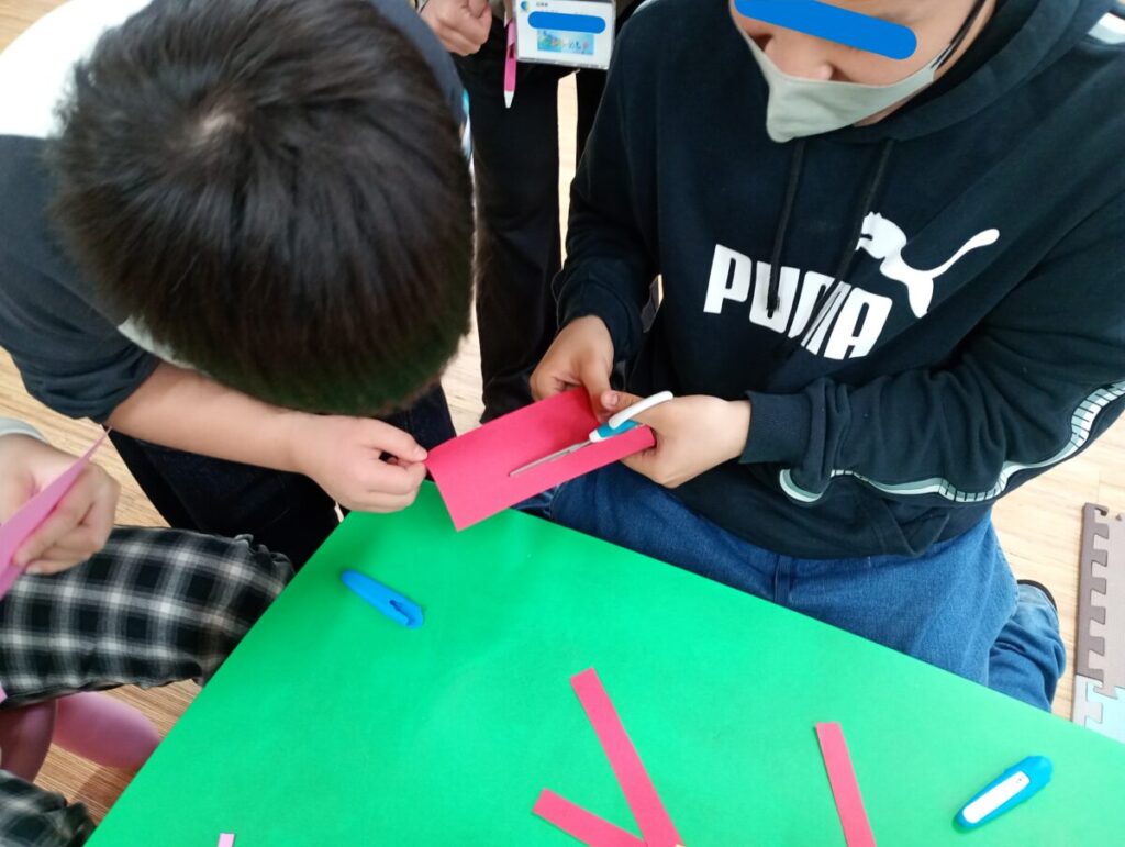 紙に定規を使って線を引くところから始めましたが、直線を引くのが難しく「ぼくには、できな~い」という声もちらほら聞こえましたが、お友だちや先生からのアドバイスを聞いてしっかりと最後までやり遂げることが出来ました🤩