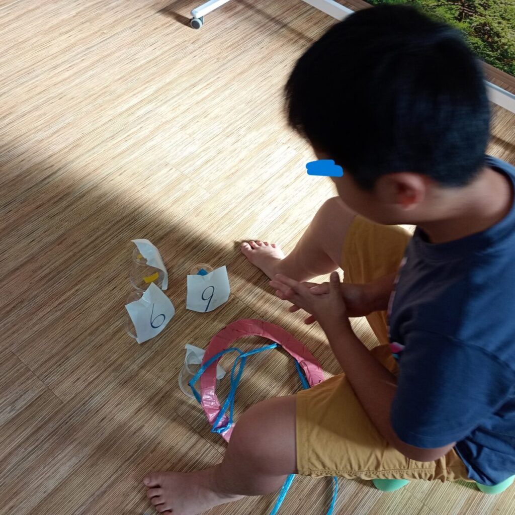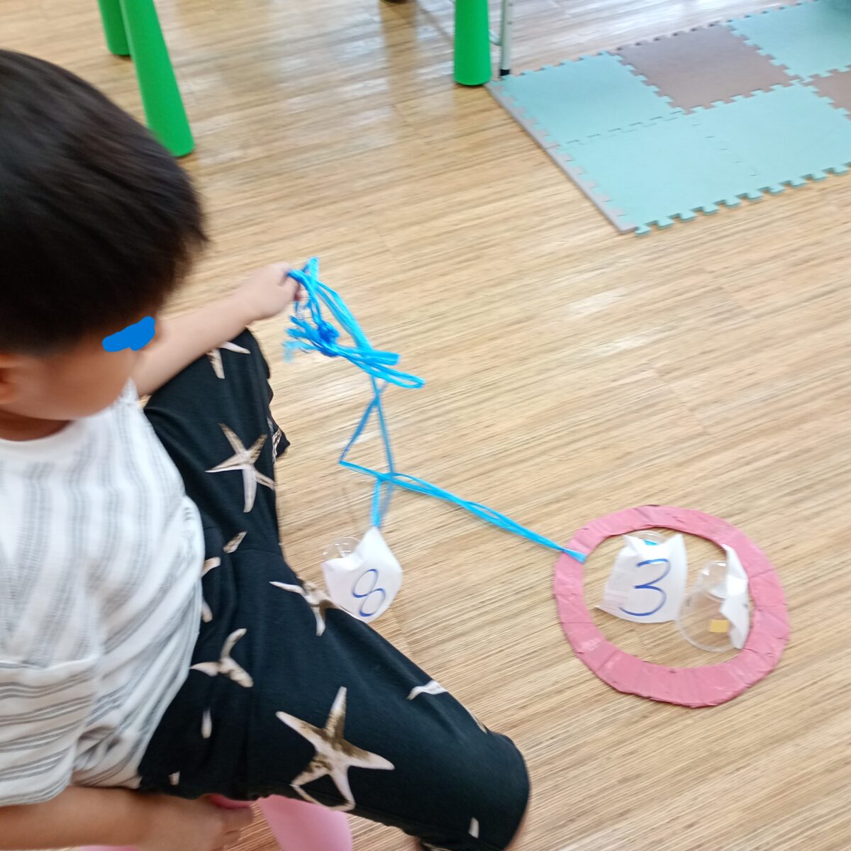 今日はフープを釣り竿代わりにし、自分で狙いを定めてフープをコントロールし、10までのお魚ならぬコップをなるべく沢山