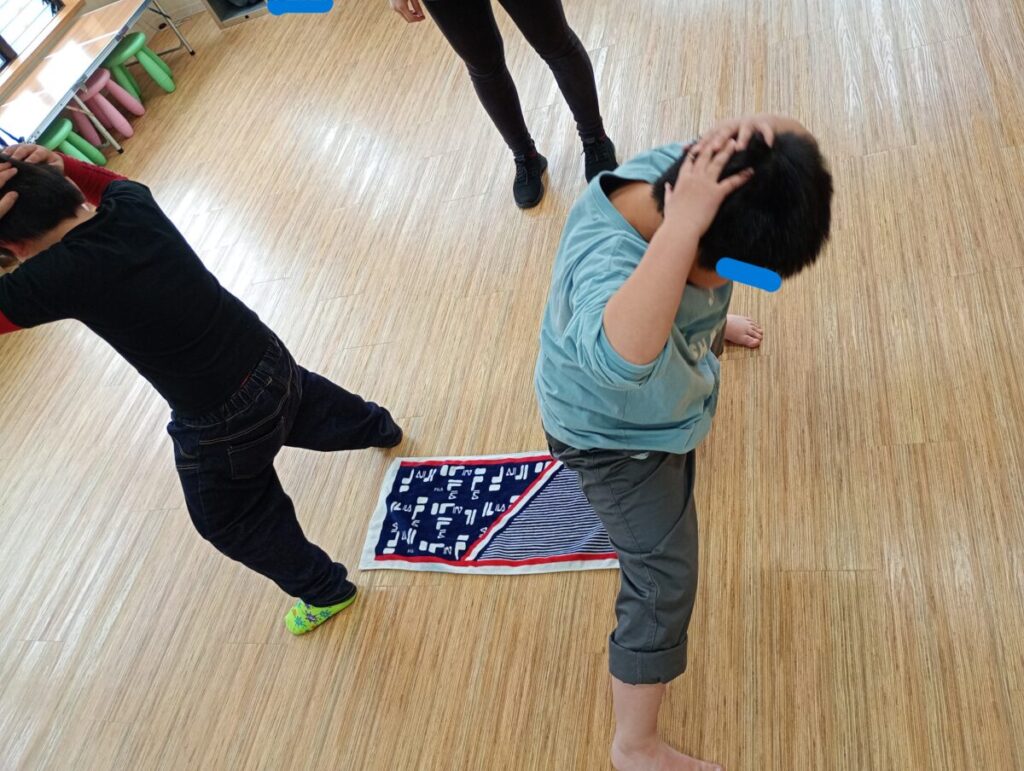 向かい合ったり、背中を向け合ったりしながら、先生の合図でタオルを瞬時に取り