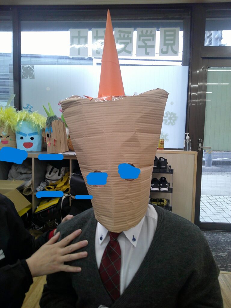 自分の思う鬼を頭の中でイメージしながら目をくりぬいたり、顔のパーツを切って貼ったりしました☺️