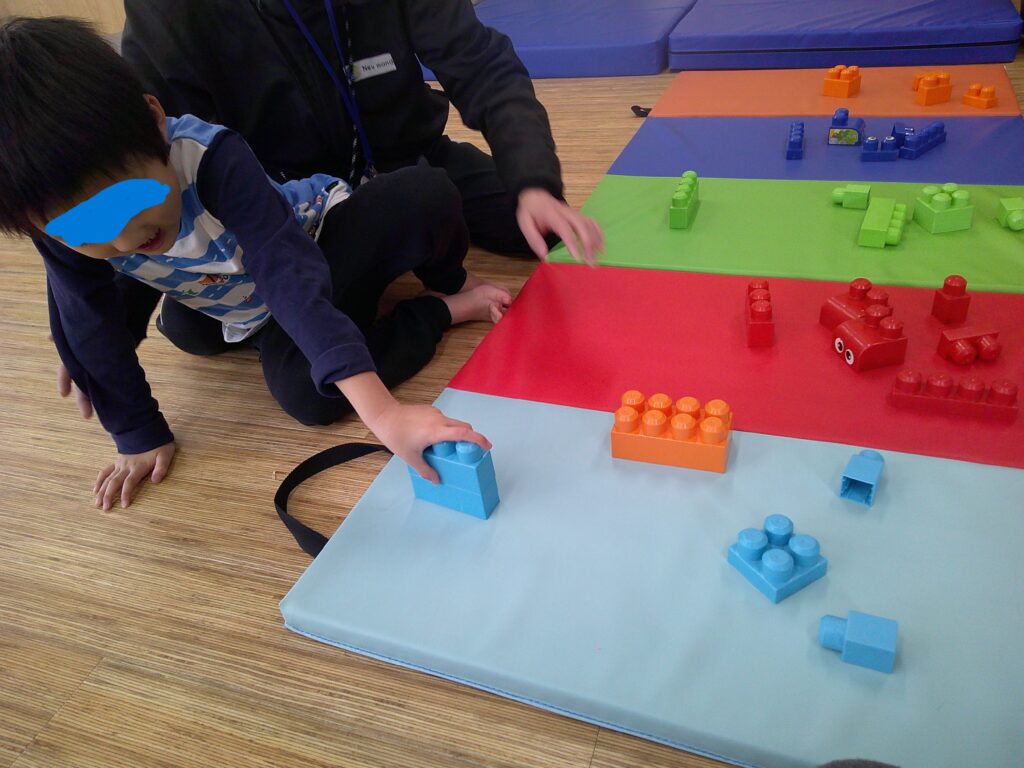 本日は、赤・黄・緑のフープの中に、同色のレゴを置いていきました。