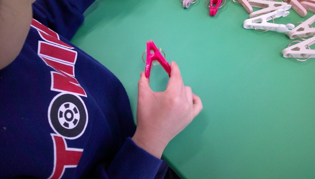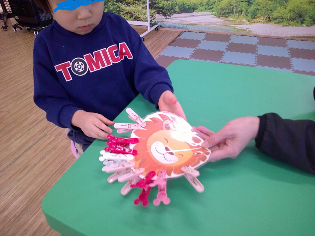 親指 人差し指 中指の3点を使って洗濯ばさみをしっかり持つ練習をしました。🌟