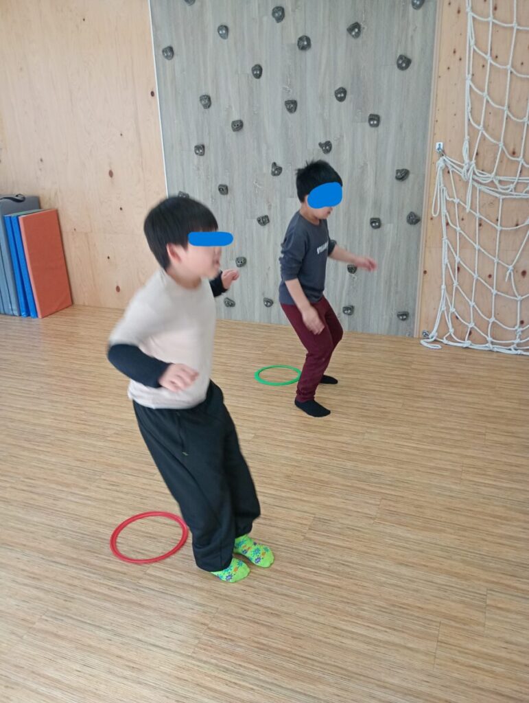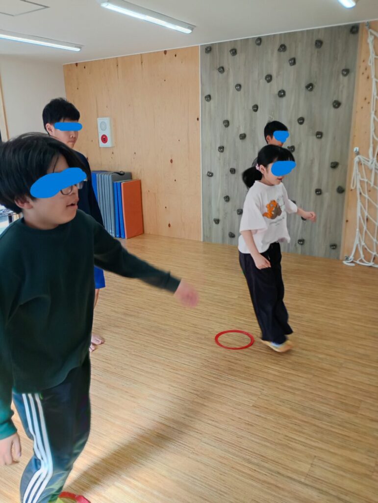 ③「右」の他に「左」「前」「後ろ」などとジャンプをする方向を指示していきます。