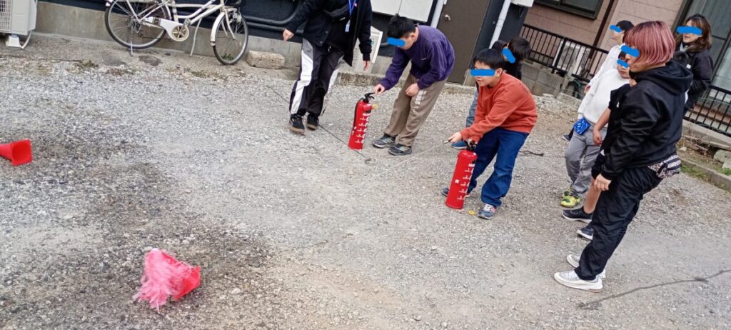 外では水の消火器を使用し、火に見立てたコーンが倒れるまで水をかけ消火しました🧑🚒