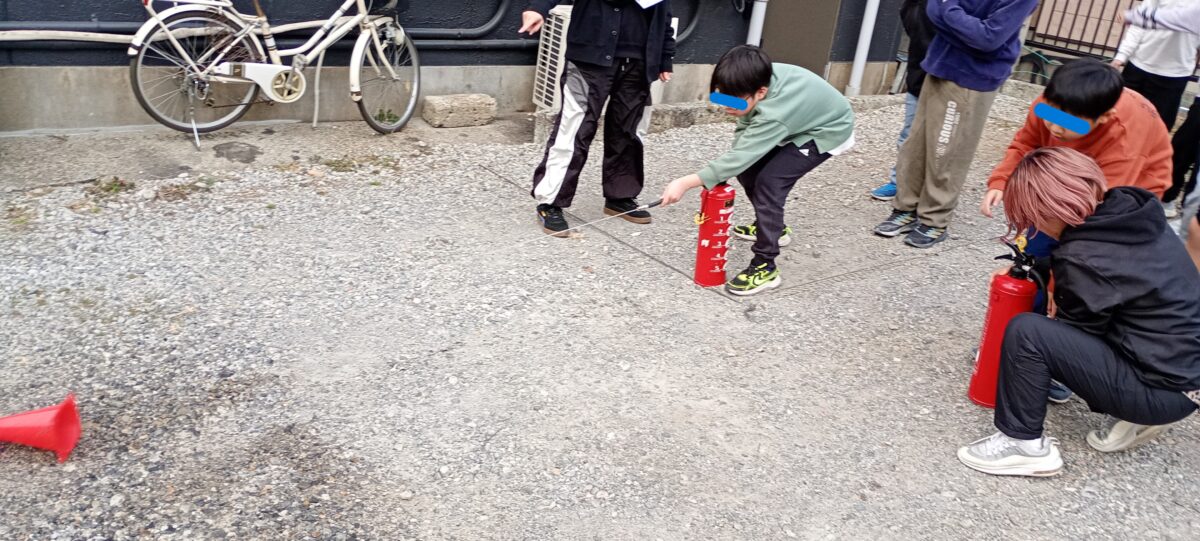 外では水の消火器を使用し、火に見立てたコーンが倒れるまで水をかけ消火しました🧑🚒
