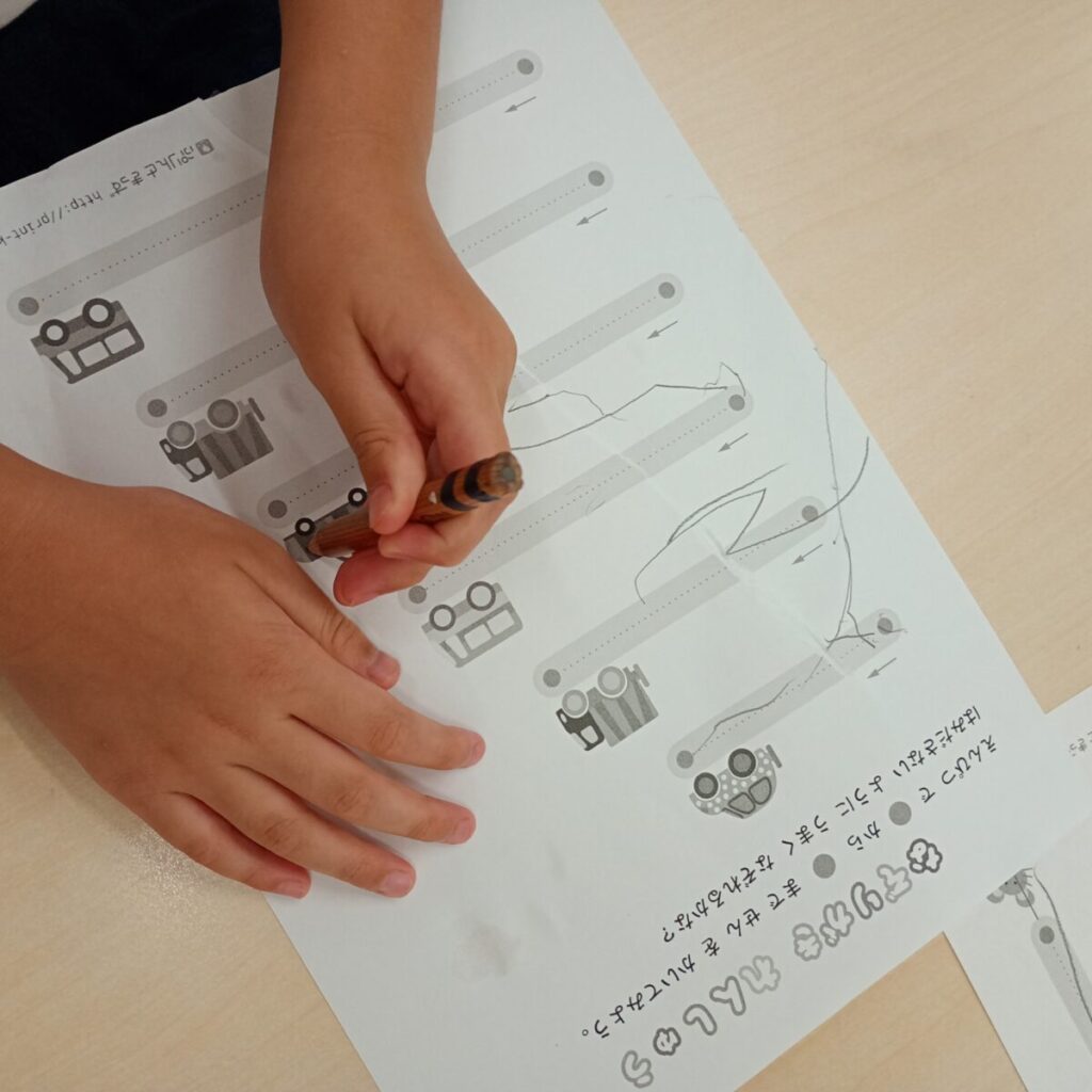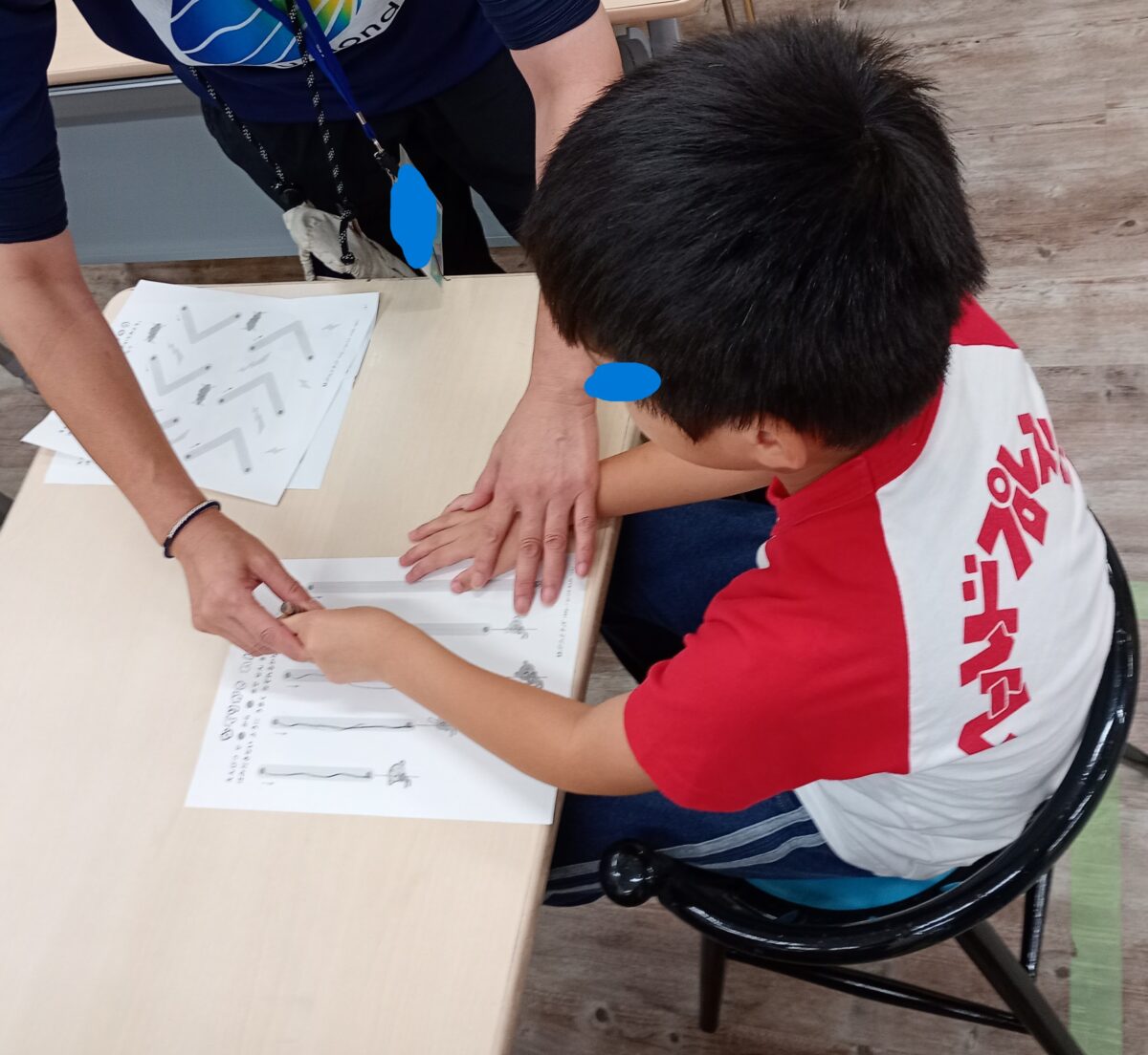 始めに、鉛筆を握ります!!最初は5本指で握っていたお友達も練習しているうちに、親指、人差し指、中指を使って