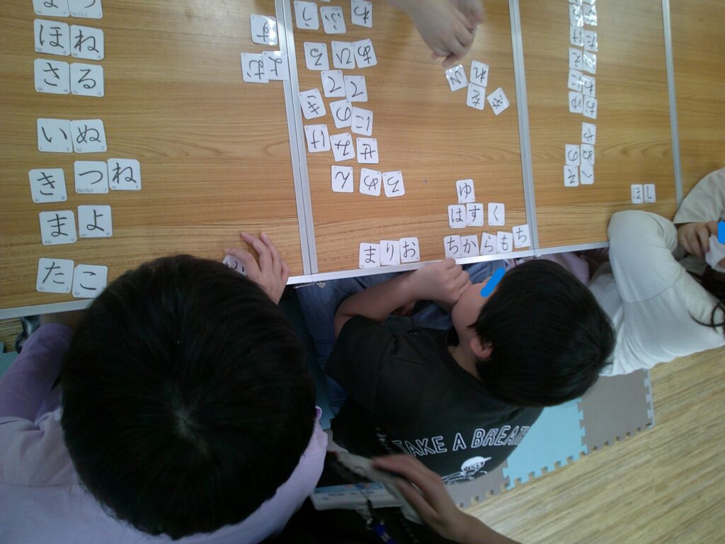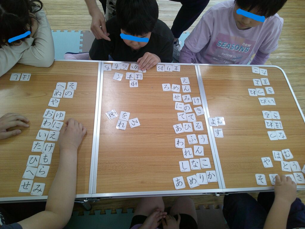 今日は50音のカードを使って、いろいろな物の名前を考えていきました。