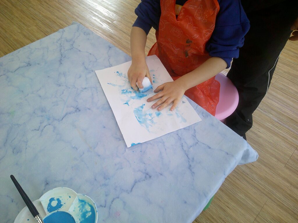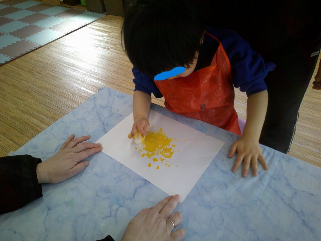 柔らかいスポンジの感覚を手で感じ取り、青や黄色の絵の具をつけてポンポンと色彩遊びをしました‼️
