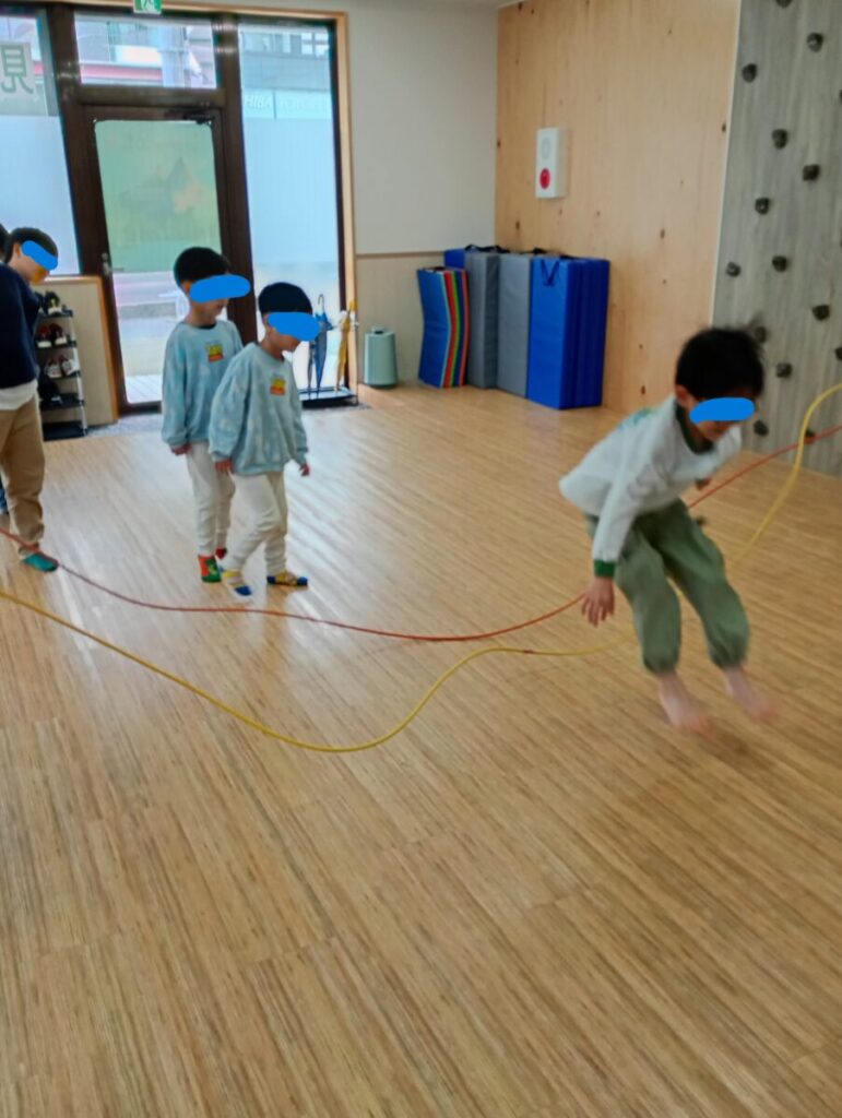 その後は大繩を2本使い、ナミナミやグルグルに先生が動かした縄を