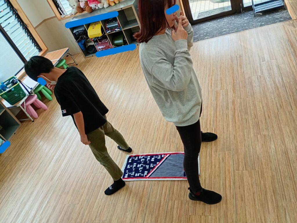 床のタオルを合図で素早く取る・集中力・瞬発力・体幹・ルール理解(抑制)を養う活動です(^^)/ 向かい合ったり、背中を向け合ったりしながら、先生の合図でタオルを…