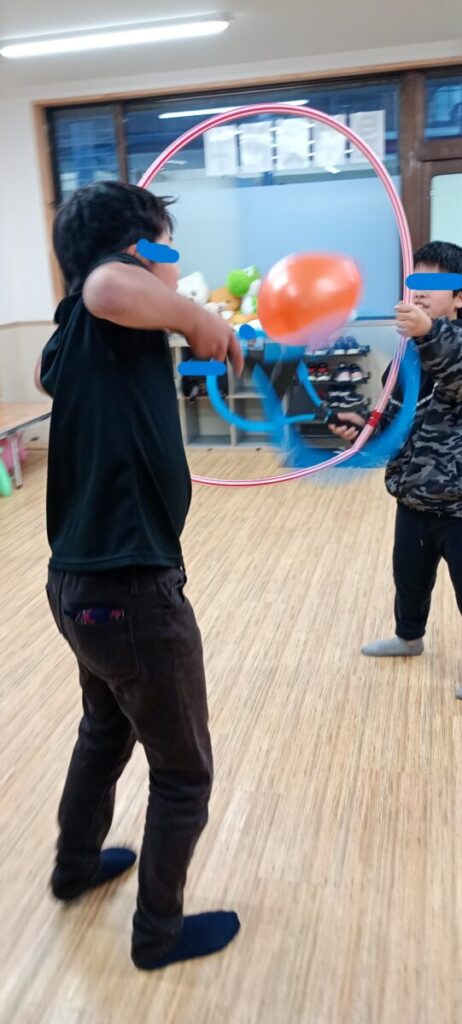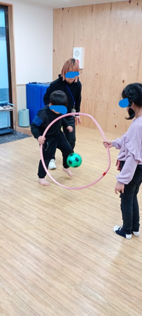 今日は、昨日に引き続きフープを利用して、サッカートレーニング⚽ 2人組でフープを持ち、フープの中にを通るように蹴ります🦿 昨日よりん難易度がUP🙂↕️ かなり…