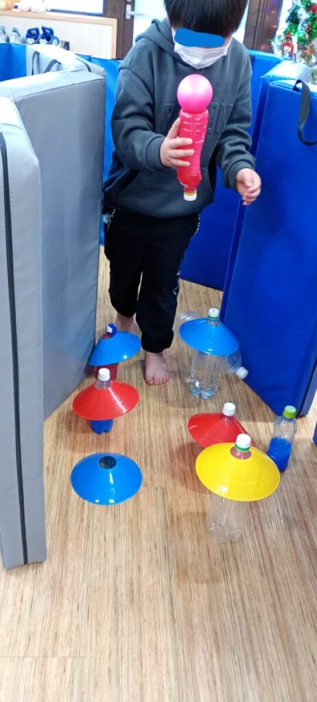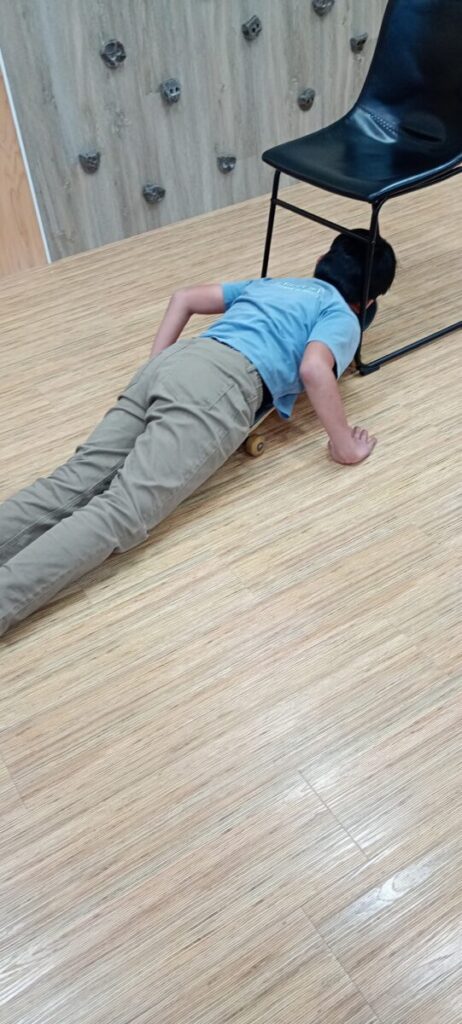 大きいお友達は、サーキットトレーニング💪 マットの隙間をスケーボーですり抜けます🛹体幹を使って、バランスを取りながらシュー🎶 その後は、椅子の下をくぐっていきま…