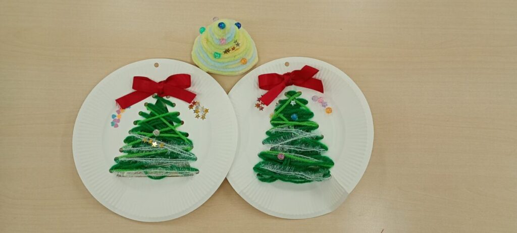 本日は、、小さいお友達もクリスマス製作に挑戦しました✌️ 紙皿を、、円錐にし周囲を可愛い毛糸でクルクルと施します🎄 更に、ビーズ等を使ってデコレーションしていき…