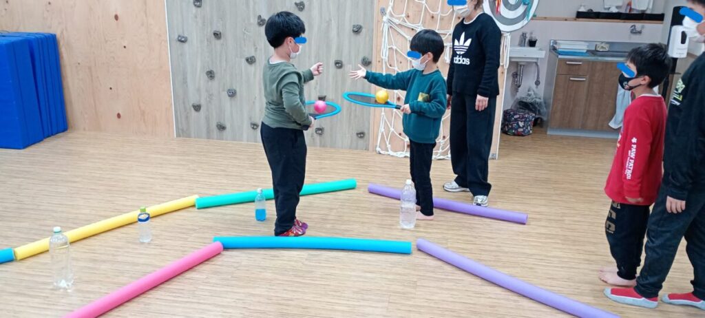 本日は、ジグザグのルートにペットボトルの障害物、更にラケットにボールを乗せ 落とさない様に。。相手の陣地へ進んで行きます!! 相手にであったら、そこで「ジャンケ…