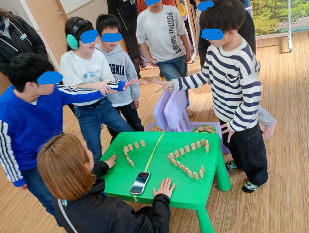 今日は2チームに分かれてジャンケン! 勝った人はドミノを並べ、負けた人は目印まで走ってタッチ! ドミノは並べられず次のお友だちにバトンタッチします🤗 先生の見本…