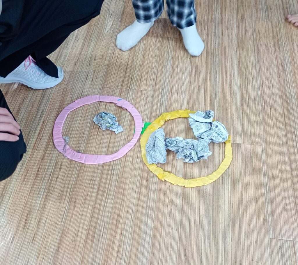 今日は洗濯ばさみバランスゲームをしました👏 2チームに分かれ、チームメイトに洗濯バサミをつけてもらいます。 準備が出来たらフープに手とつま先を置きます。 1分以…